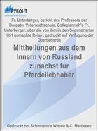 Unterberger, Fr. Mittheilungen aus dem Innern von Russland zunachst fur Pferdeliebhaber / bericht des Professors der Dorpater Veternachschule, Collegienrath's Fr. Unterberger, uber die von ihm in den Sommerferien 1851 gemachte Reise , gedruckt auf Verfugung der Oberbehorde; Fr. Unterberger .— : Gedruckt bei Schumann's Wittwe & C. Mattiesen, 1853 .— 136 с. — Lang: ger .— URL: https://rucont.ru/efd/112645 (дата обращения: 15.11.2025)