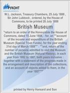 British Museum : "return to an order of the Honourable the House of Commons, dated 15 June 1888, - for, an ""account of the income and expenditure of the British Museum (Special Trust Funds), for the year ending 31st day of March 1888"" : ""and, return of the number of persons admitted to visit the Museum and the British Museum (Natural History), in each year from 1882 to 1887, both years inclusive : together with a statement of the progress made in the arrangement and description of the collections, and an account of objects added to them, in the year 1887""" / W.L. Jackson, Treasury Chambers, 25 July 1888 , Sir John Lubbock , ordered, by the House of Commons, to be printed 26 July 1888 .— : printed by Henry Hansard and Son, 1888 .— 77 с. — Lang: eng .— URL: https://rucont.ru/efd/125352 (дата обращения: 12.11.2025)