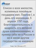 Список о всех милостях, излиянных покойным государем имп. Павлом I, в день его коронации, 5 апреля 1797 года, благотворительность и щедрость его великой души ознаменовавших, и пример себе ни в России и ни в каком другом государстве не имеющих .— : Унив. тип. (Катков и К°), 1867 .— 21 с. — URL: https://rucont.ru/efd/51981 (дата обращения: 07.11.2025)