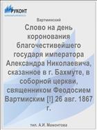 Вартминский, Ф. Слово на день коронования благочестивейшего государя императора Александра Николаевича, сказанное в г. Бахмуте, в соборной церкви, священником Феодосием Вартмиским [!] 26 авг. 1867 г. / Ф. Вартминский .— : тип. А.И. Мамонтова, 1868 .— 10 с. — URL: https://rucont.ru/efd/58208 (дата обращения: 07.11.2025)