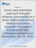 Мелитон. Слово пред избранием судей для Киевской губернии, произнесенное в Киево-Софийском соборе Киевской духовной академии бакалавром богословских наук, соборным иеромонахом Мелитоном. Окт. 22, 1835 г. / Мелитон .— : Тип. Киево-Печер. Лавры, 1835 .— 21 с. — URL: https://rucont.ru/efd/64345 (дата обращения: 10.11.2025)