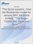 Bowring, J. "The Syrian question : from the Westminster review for January 1841, the article entitled, ""The Anglo-Turkish War, Egypt and Syria""" : "with a postscript, in reply to an article in the Edinburgh review, entitled ""France and the East""" / J. Bowring .— : Hooper, 1841 .— 46 с. — Lang: eng .— URL: https://rucont.ru/efd/85393 (дата обращения: 18.11.2025)
